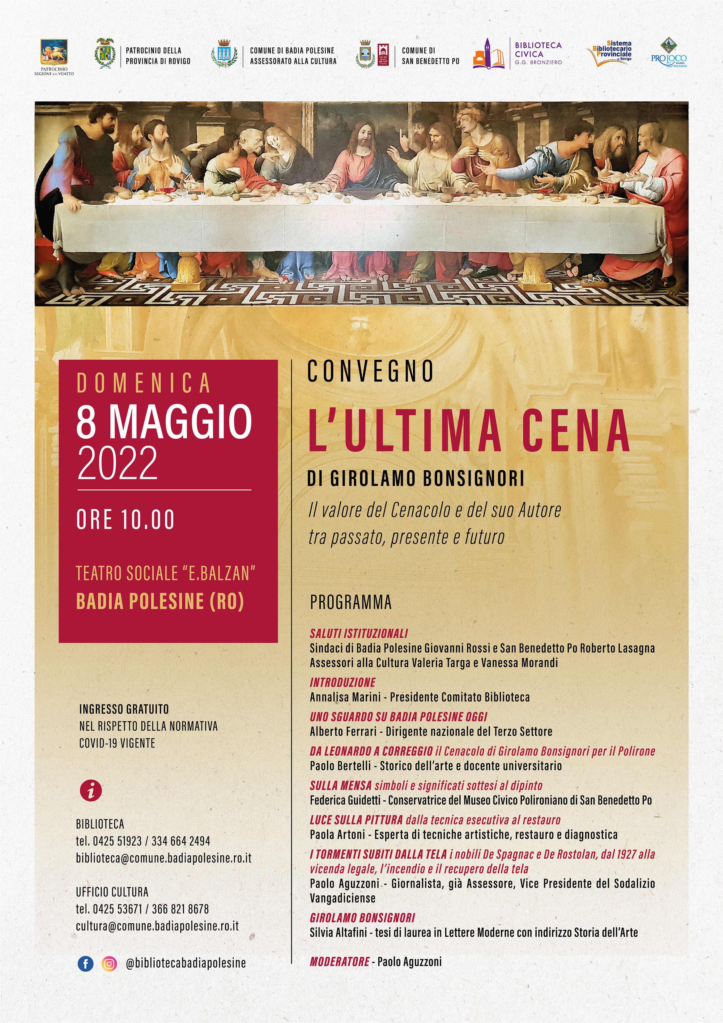 Il convegno, ideato per tenere viva la memoria della maestosa opera, ripercorre la storia, le vicissitudini e le vicende legali che la tela ha subito nel tempo, fino ai giorni nostri. Il prestito dell’opera è frutto di collaborazione tra gli amministratori dei comuni di Badia Polesine (Ro) e San Benedetto Po (Mn), è un atto di grande valore culturale, un segno di sensibilità e lungimiranza. “Oltre a essere un’importante testimonianza critica e artistica” -come scrisse il Vasari- diventa simbolo di cooperazione, condivisione e ritrovata armonia. Il dipinto si ispira al Cenacolo realizzato da Leonardo da Vinci per il refettorio di Santa Maria delle Grazie, il Bonsignori lo aveva concepito nel 1514 circa quale fulcro dell’affresco del refettorio polironiano dipinto da Antonio Allegri detto il Correggio.