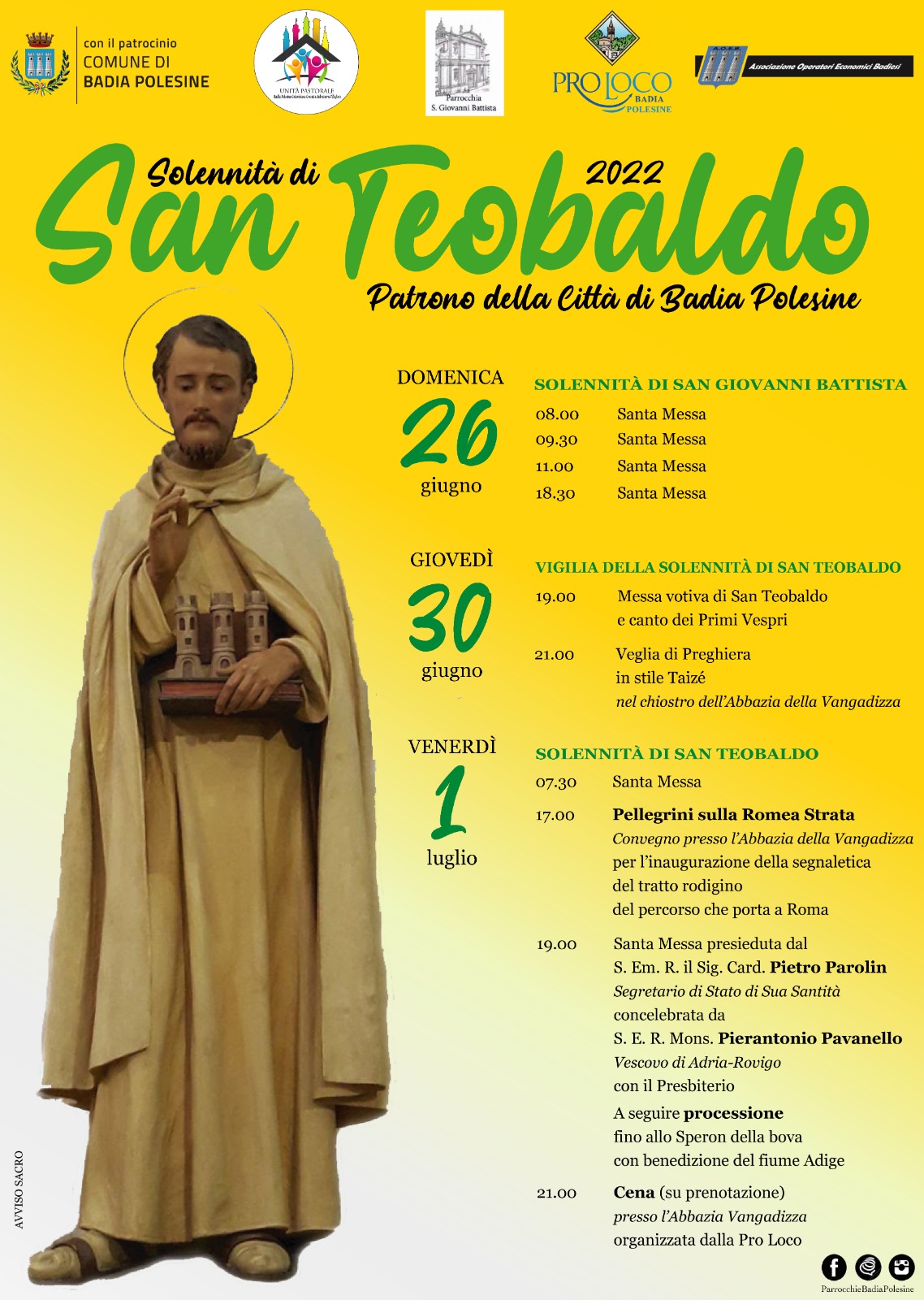 In occasione del Santo Patrono di Badia Polesine, San Teobaldo che ricorre il 01 LUGLIO, la città presenta diverse iniziative per celebrarne la solennità.