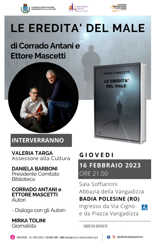 Si terrà GIOVEDI 16 FEBBRAIO alle ore 21.00 in Sala Soffiantini - Abbazia della Vangadizza, la presentazione del libro LE EREDITÀ DEL MALE di Corrado Antani e Ettore Mascetti, scrittori polesani.