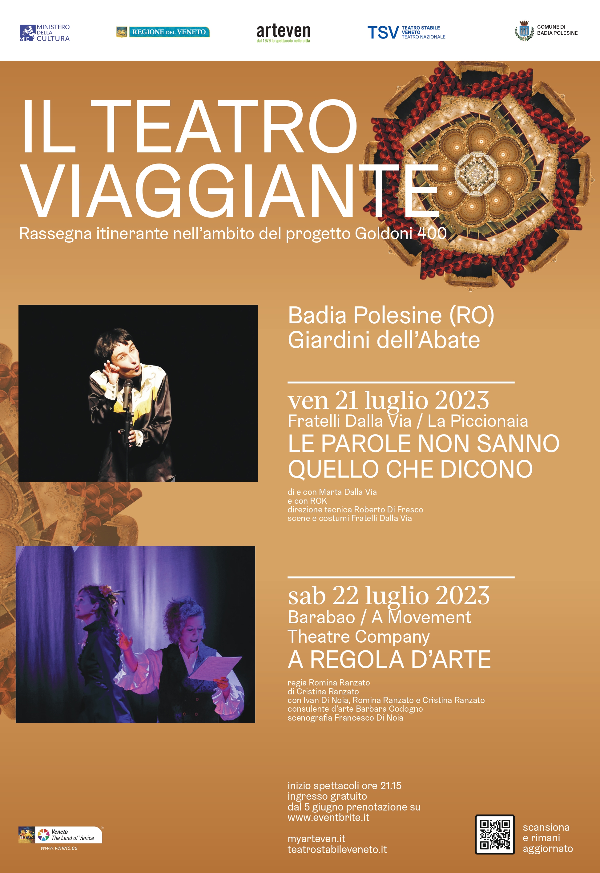 Si terranno VENERDI 21 LUGLIO e SABATO 22 LUGLIO 2023, alle ore 21.15, presso il GIARDINO DELL'ABATE in Abbazia della Vangadizza, due dei 28 spettacoli in programma della rassegna itinerante "Il Teatro Viaggiante", nell'ambito del progetto “Goldoni 400”.