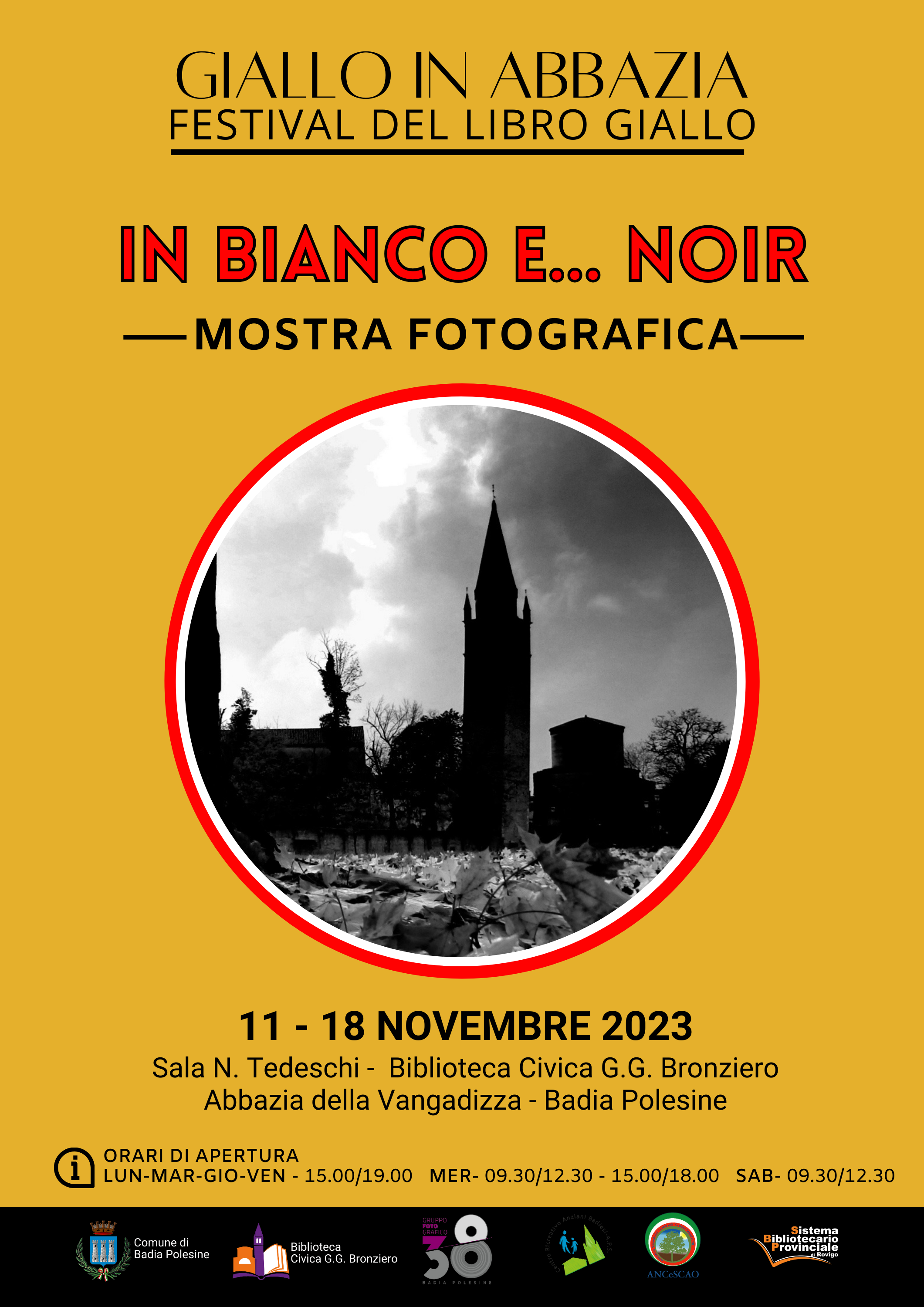 In occasione de GIALLO IN ABBAZIA - FESTIVAL DEL LIBRO GIALLO, il Gruppo Fotografico 38 di Badia Polesine allestisce presso la Sala Tedeschi della Biblioteca Civica, la mostra fotografica "IN BIANCO E... NOIR".