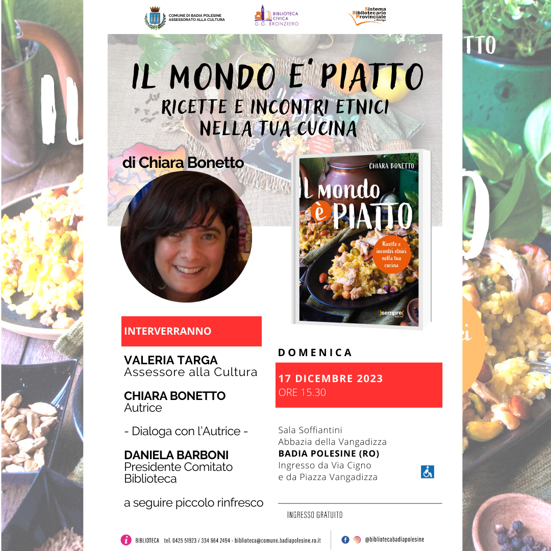 Si terrà DOMENICA 17 DICEMBRE alle ore 15.30 in Sala Soffiantini - Abbazia della Vangadizza, in occasione della giornata dedicata ai mercatini di Natale, la presentazione del libro IL MONDO E' PIATTO - RICETTE E INCONTRI ETNICI NELLA TUA CUCINA di Chiara Bonetto.